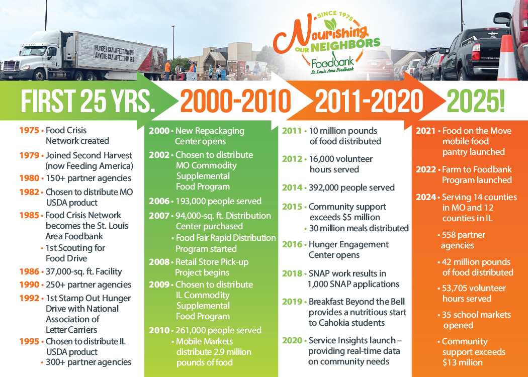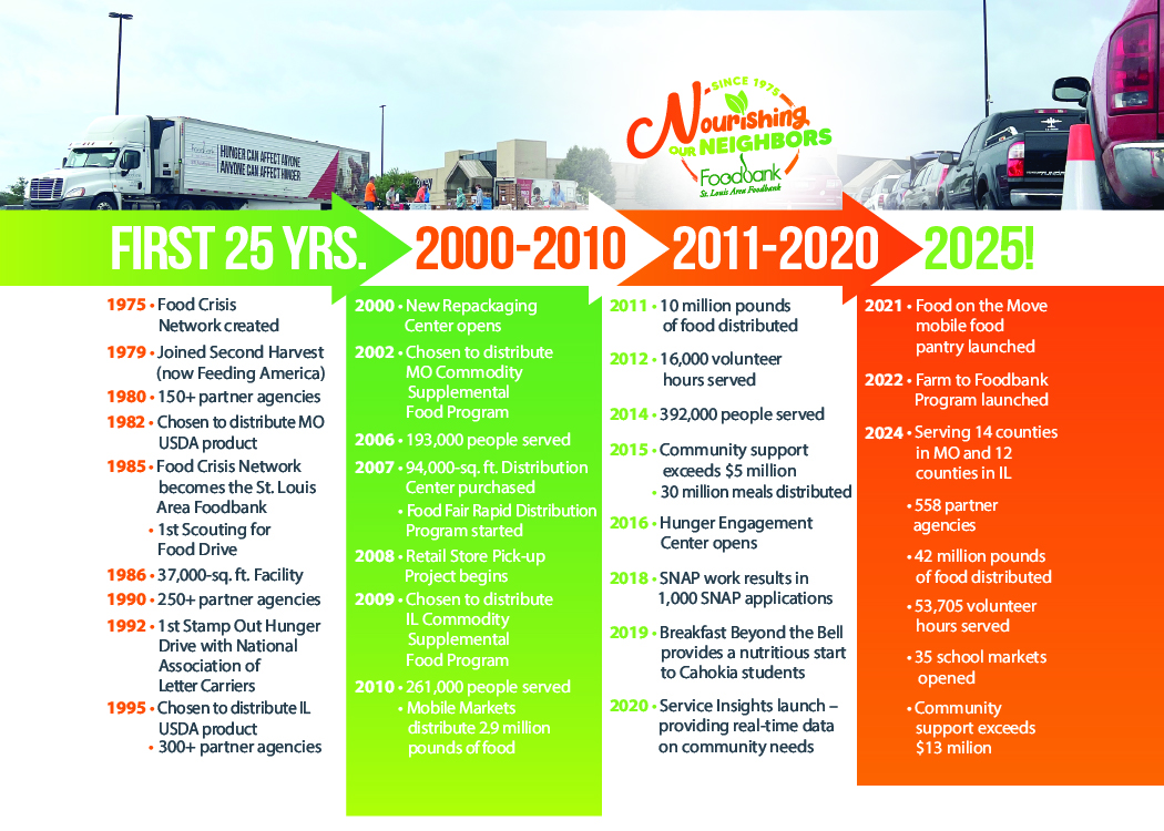 In July of 1975, the Food Crisis Network was created in recognition of the growing need for food assistance in the region. Since then, we have evolved into the St. Louis Area Foodbank. Today, we serve 26 counties throughout Eastern Missouri and Southwestern Illinois. Last year, we fed 1,213,136 individuals through our mobile distribution events, school markets, and partnerships with nearly 600 partner agencies.
