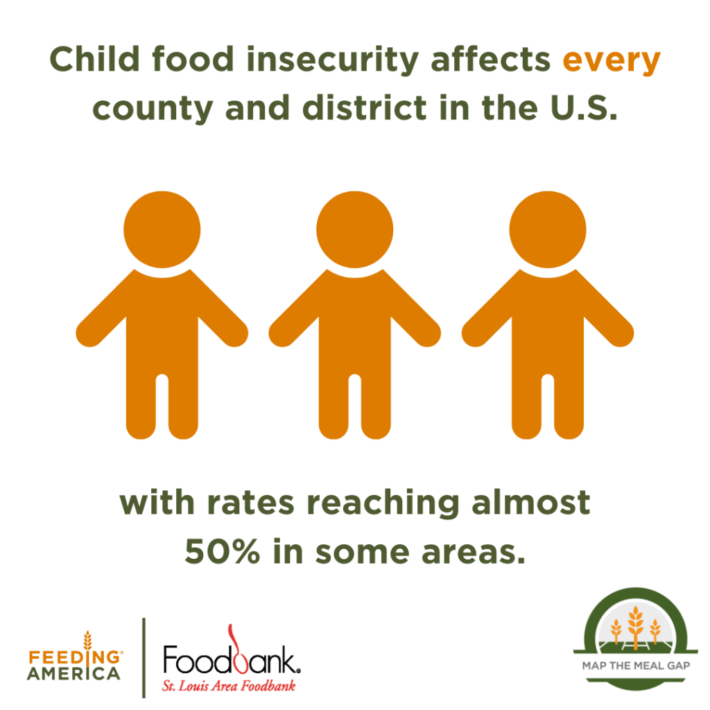 May 14, 2025 [Bridgeton, MO] – Child food insecurity affects every county in the United States, with rates reaching almost 50% in some areas, according to Feeding America’s annual Map the Meal Gap study. At the local level, Map the Meal Gap finds that 1 in 7 people, including 1 in 6 children in the bi-state region are food insecure. St. Louis Area Foodbank is part of the Feeding America nationwide network of more than 200 food banks, 22 statewide food bank associations and 60,000 agency partners, food pantries and meal programs.